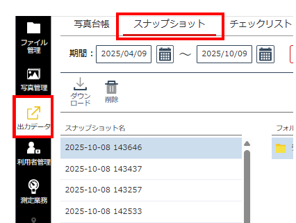 2. 「出力データ」から「スナップショット」タブを開きます。