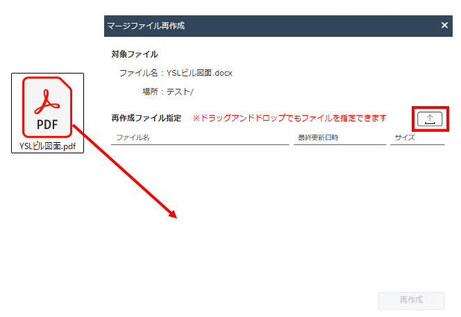 または、「再作成ファイル指定」の右にあるアップロードアイコンをクリックし、PDFファイルを指定します。