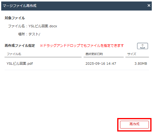 5. 「マージファイル再作成」画面の「再作成ファイル指定」箇所にPDFファイル(こちらの方法等により作成した